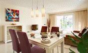 Todos los apartamentos disfrutan de una sala de estar espaciosa y luminosa, 2 dormitorios, baño y una terraza o jardín con vistas a la piscina, ideal para relajarse.